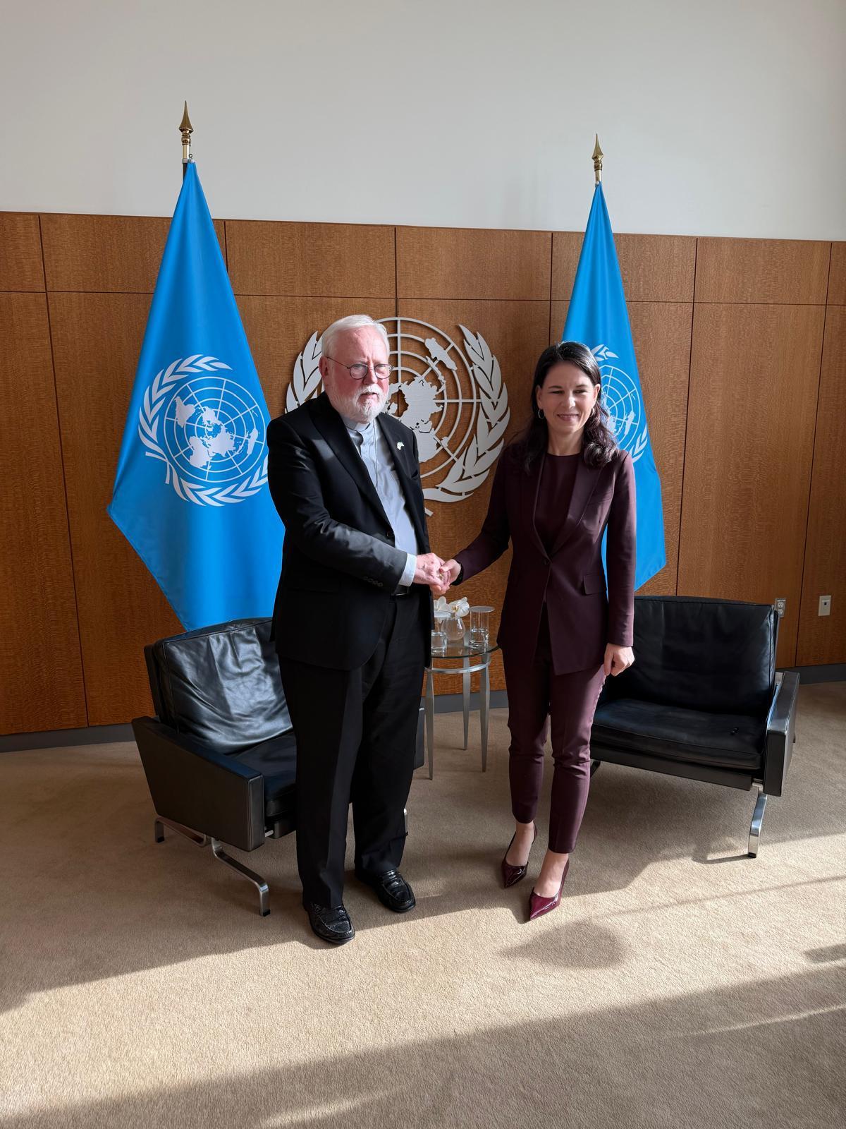 H.E. Archbishop Gallagher, Secretary for Relations with States and International Organizations of the Holy See, meets with the United Nations Secretary General Mr. António Guterres and the President of the 80th General Assembly Ms. Annalena Baerbock