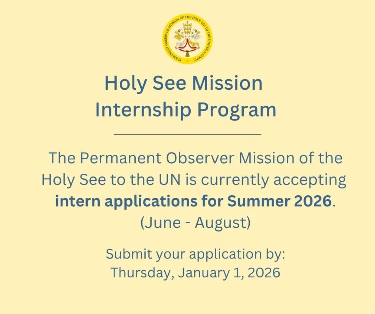 Our interns are integral to the work of the Holy See at the United Nations. They attend various UN meetings, conferences, and debates, and then prepare reports that, once reviewed, are sent to the Holy See’s central offices in the Vatican. Our interns also assist with the Mission’s conferences, receptions, and cultural events.