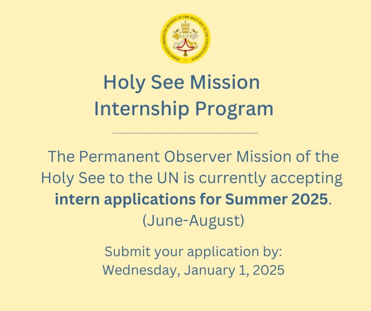 Since 2015, the Holy See Mission has welcomed 229 interns from 40 countries. The internship program provides the opportunity for bright, Catholic, English-speaking college graduates or graduate students to gain experience assisting the Holy See in its multilateral work at the UN, seeking to bring the light of Catholic Social Teaching to the debates of the international community.
