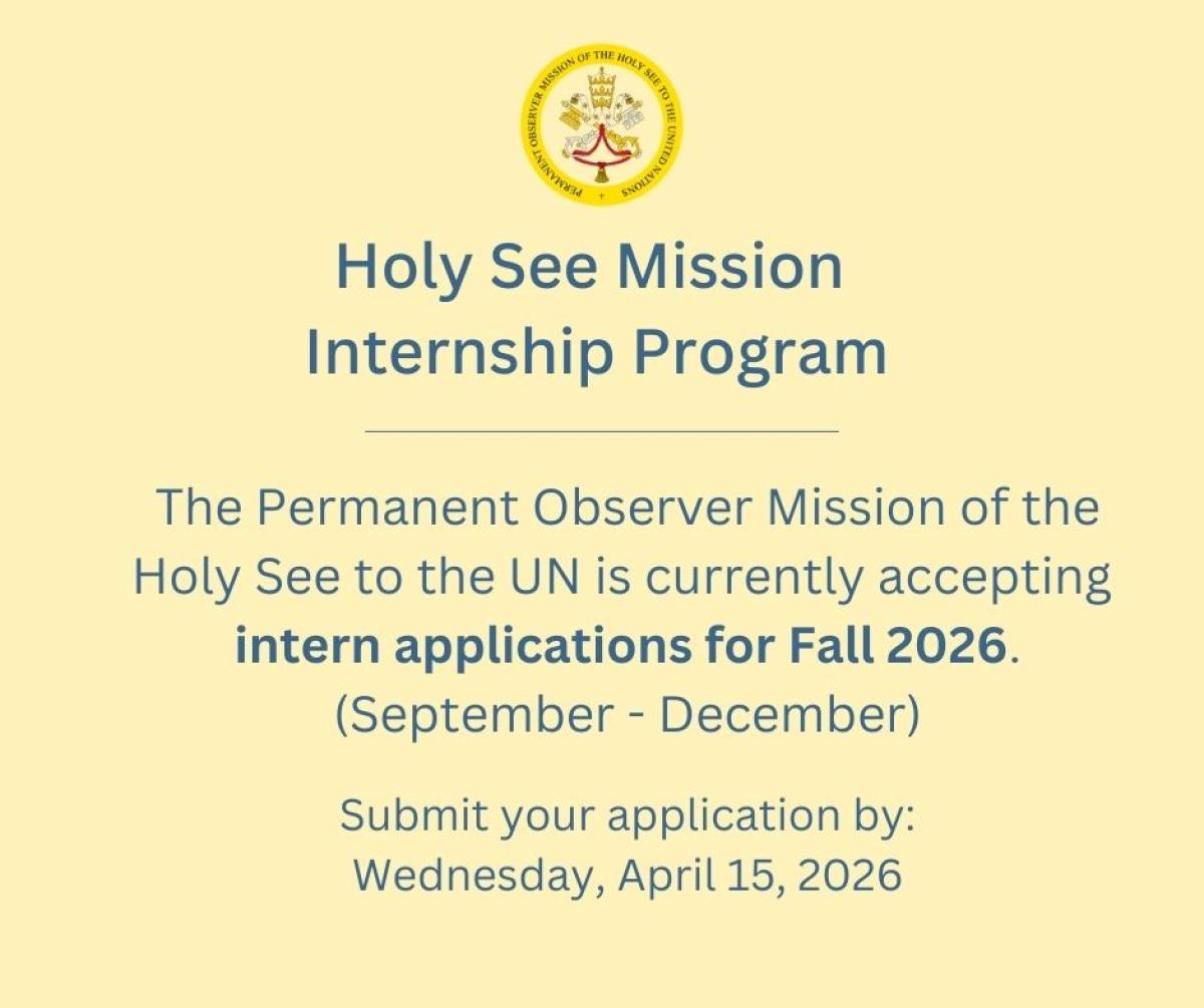 Since 2015, the Holy See Mission has welcomed 238 interns from 40 countries. The internship program provides the opportunity for bright, Catholic, English-speaking college graduates or graduate students to gain experience assisting the Holy See in its multilateral work at the UN, seeking to bring the light of Catholic Social Teaching to the debates of the international community.